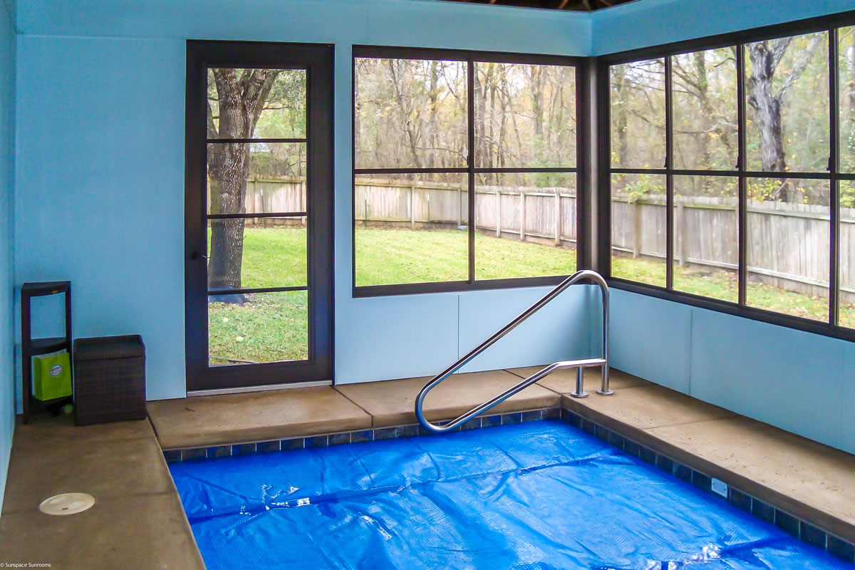 This client wanted year round protection for the new lap pool built by our local pool contractor.  We utilized our Weathermaster Horizontal sliders.  The fixed screen on the window units give 100% bug protection and the sliders adjust air flow and keep out the elements.  Our door system has the Weathermaster vertical stacking window which also gives you bug and element protection.  All custom made to fit your required openings.